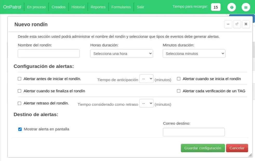 El operador puede programar con anticipación cada rondín y la frecuencia del mismo. Con la configuración de alertas en pantalla o vía email se podrá notificar cuando los rondines estén por iniciar o finalizar, si tienen algún retraso y cuando cuando la verificación de los códigos QR está hecha en sitio y momento donde corresponde.
